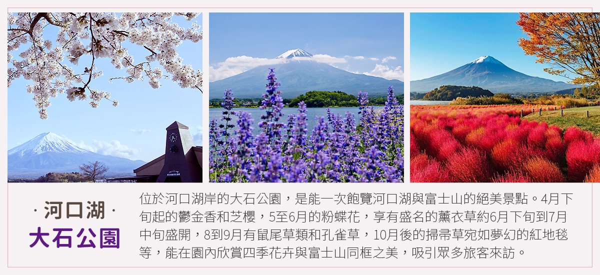 【河口湖】位於富士箱根伊豆國立公園的河口湖,是富士五湖其中一湖。河口湖在富士五湖當中位置最北,擁有最長的湖岸線與最低的海拔地點,在五湖之中最早以作為觀光景點被開發。來到河口湖,不只可以遙望山峰連綿的美景,更可以一賭象徵日本、代表日本精神的富士山。