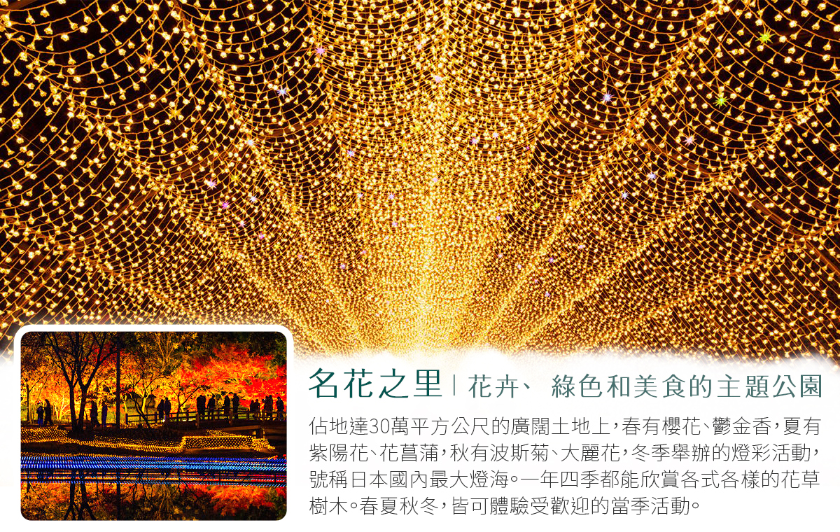 【名花之里】位於三重縣桑名市長島町,是大型花卉主題公園。園區四季皆有不同的花卉展出,並融合自然景觀、溫泉、餐飲與夜間燈飾,是日本知名的賞花與觀光勝地。春季有鬱金香、櫻花。夏季有繡球花、紫陽花、百合。秋季則有大波斯菊與紅葉。冬季則以燈光秀為最大亮點。世界級燈光秀(illumination):每年秋冬至隔年春季舉辦的「燈光祭典」,是日本規模最大之一。以數百萬顆LED燈泡打造壯麗場景,主題會隨年度更替,吸引無數遊客前來。名花之里將「花卉之美」與「夜間燈光藝術」完美結合,無論白天或夜晚都充滿魅力,是中部地區不可錯過的觀光亮點。