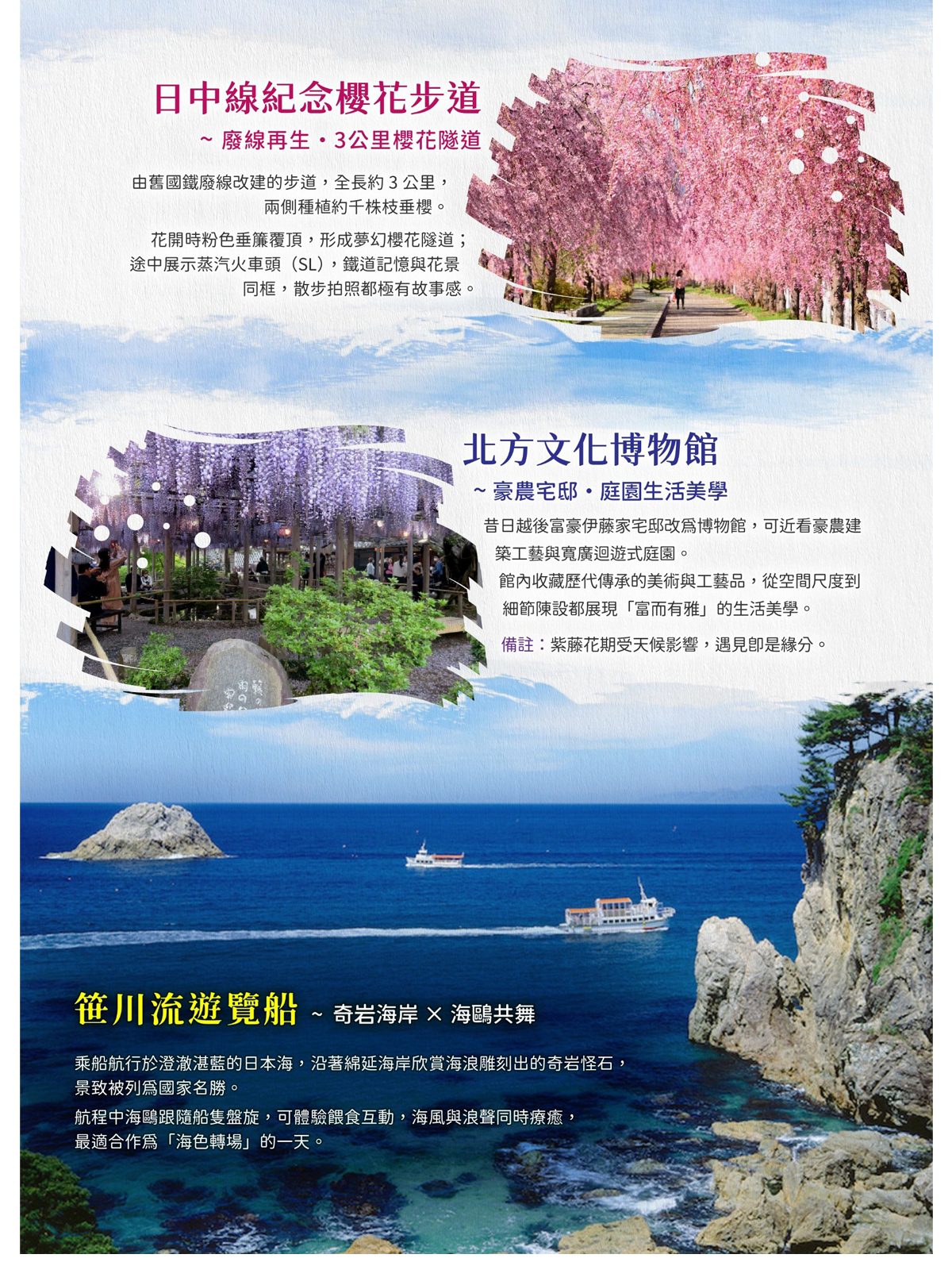 飯店 / 日中線紀念櫻花步道 / 北方文化博物館 / 與海鷗共遊日本海~笹川流遊覽船 / 湯野濱溫泉