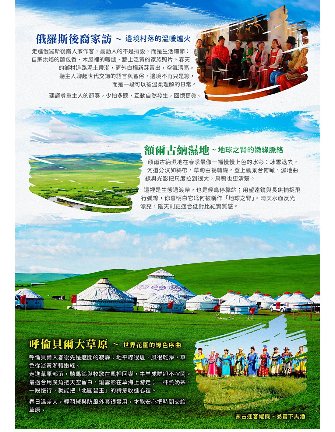 巴爾虎蒙古部落,激情那達慕-大型馬之舞表演秀巴爾虎蒙古部落民俗旅遊度假景區位於滿洲里以東36公里。位於301國道於滿洲里至額爾古納公路交界處,其是呼倫貝爾唯一家以展現原生態巴爾虎民族、民風、民俗為特點的民族風情旅遊景點。全方位、多角度向遊客展示蒙古民族博大精湛的文化。它位於巴爾虎草原腹地,這裏夏秋兩季,綠草如茵,牛羊肥壯,氣候涼爽,幽靜宜人。(0525-0915期間表演,不便之處敬請見諒)