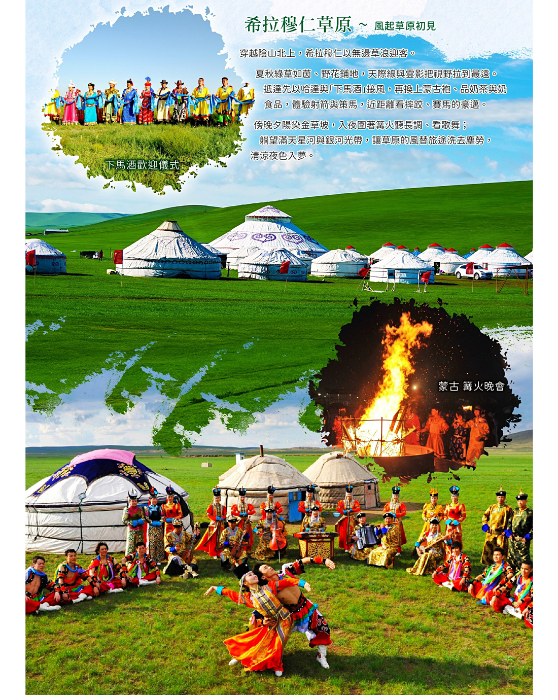 【希拉穆仁草原】位居包頭市達茂旗的東南部,是蜚聲海內外的旅遊避暑勝地,又因希拉穆仁河畔有座歷史久遠的席力圖召,故又名"召河"。希拉穆仁,蒙語意為“黃色的河”,距離呼和浩特向北 100 公里。晝夜溫較大,盛夏之夜,也涼爽似秋。