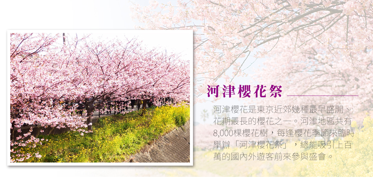 【河津櫻花】每年二月到三月間,位於日本伊豆的河津櫻花迎來盛開季節,河津櫻是早春櫻花的代表品種,花朵顏色鮮豔、花期較長,通常持續約一個月,讓遊客可以充分享受櫻花盛開的美麗。在河津櫻花的花海中,粉紅色的花瓣與湛藍的天空、清澈的河水交織成一幅如詩如畫的美景。漫步在河津溪谷兩岸,花香四溢,櫻花樹成排綿延,令人感受到春天的氣息。這裡不僅是攝影愛好者的天堂,也成為情侶和家庭聚會的理想場所。