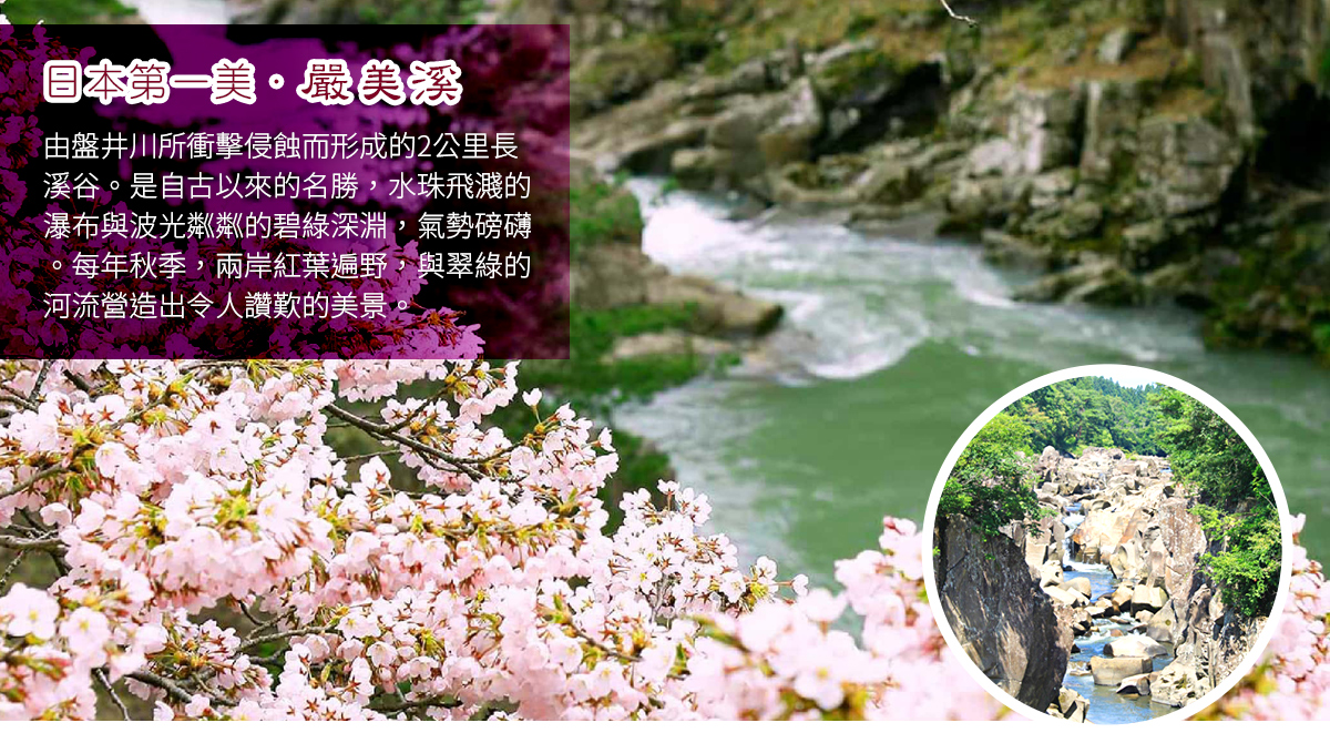 ★【猊鼻溪遊船】被稱為天然紀念品的猊鼻溪,從栗駒山到盤井川的中游,在綿延約二公里沿路上展開了一連串的自然藝術品,巨石經長年急流侵蝕而創造出大小瀑布峽谷大自然美景,溪谷也因多樣化的侵蝕,讓人感受到自然界的嚴苛與柔和。