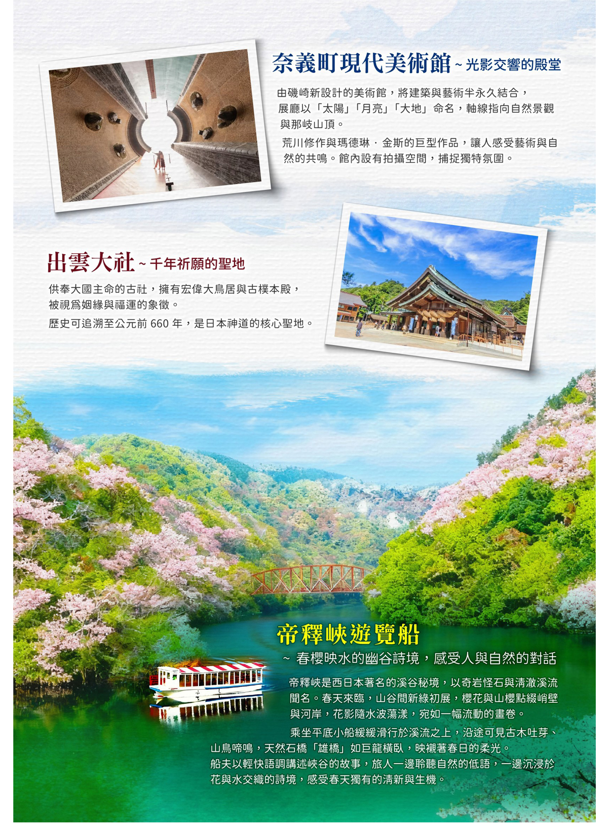 【帝釋峽遊覧船】是西日本著名的溪谷美景地之一。這裡以峽谷間的奇岩怪石、清澈溪流與壯麗紅葉而聞名,被譽為中國地區的秘境。每到秋天,山林漸染紅黃,倒映在水面如詩如畫,吸引無數遊客慕名而來。搭乘帝釋峽遊覽船是欣賞這片自然美景最詩意的方式。平底小船緩緩滑行於清流之上,沿途可見峭壁陡立、古木參天,還有著名的天然石橋「雄橋」,彷彿一座巨龍橫臥於峽谷之中。船夫會以輕鬆的語調講解沿岸地形與歷史,讓旅人一邊沉浸於靜謐山水間,一邊感受人與自然的對話。