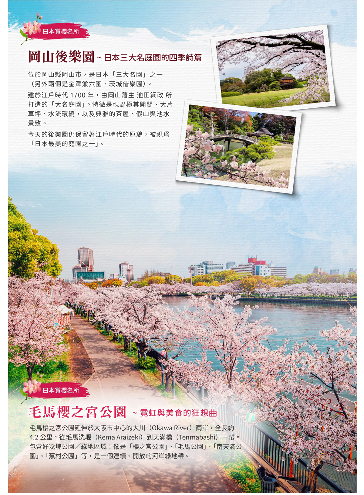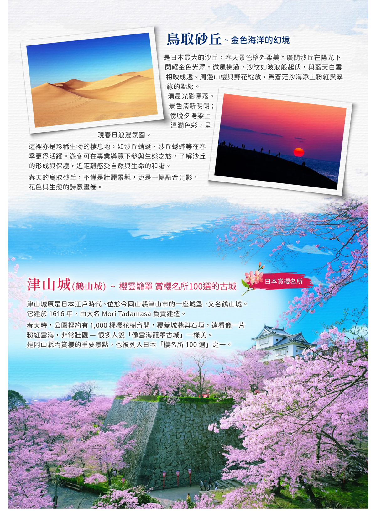 【津山城】津山城原是日本江戶時代、位於今岡山縣津山市的一 座城堡,又名鶴山城。它建於 1616 年,由大名 Mori Tadamasa 負責建造。春天時,公園裡約有 1,000 棵櫻花樹齊開,覆蓋城牆與石垣,遠看像一片粉紅雲海,非常壯觀-很多人說「像雲海籠罩古城」一樣美。是岡山縣內賞櫻的重要景點,也被列入日本「櫻名所 100 選」之一。