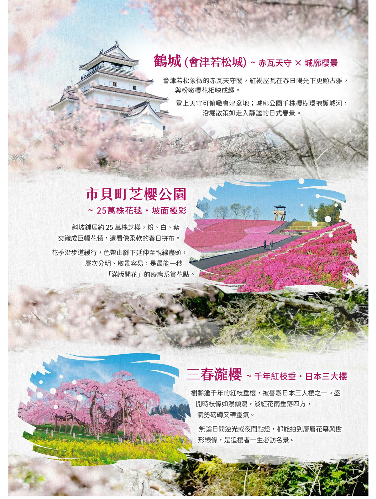 ※備註:【櫻花盛開季節】依每年天候因素影響,櫻花變化無法完全掌握,全看您和日本櫻花的緣份,敬請瞭解。如遇天候因素(下雨.颳風或氣溫..)其凋謝或未綻開,會依原行程前往景點純欣賞,請見諒。