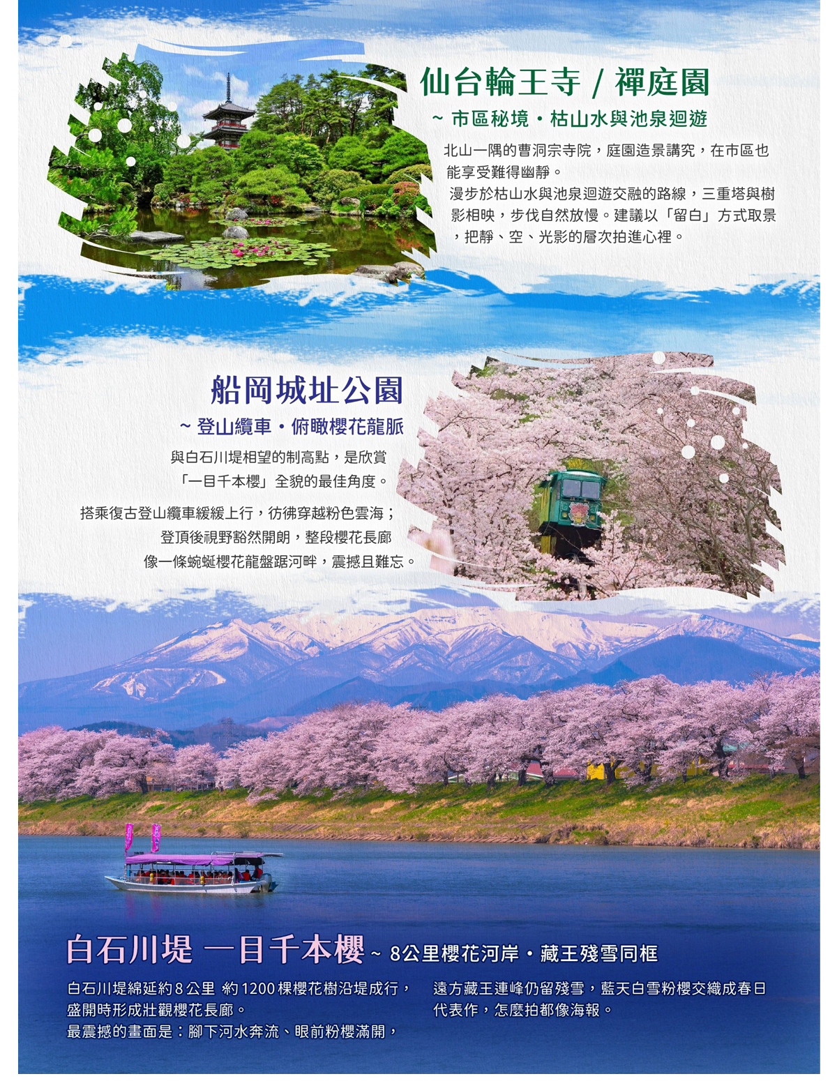 【白石川堤 一目千本櫻】宮城縣著名的賞櫻勝地。在白石川的堤防上,綿延約 8 公里的櫻花隧道種植了約 1200 棵櫻花樹。最令人讚嘆的絕景是:眼前是奔流的白石川與滿開的櫻花,背景則是還留有殘雪的藏王連峰,藍天、白雪、粉櫻交織成一幅壯麗的春日畫卷。