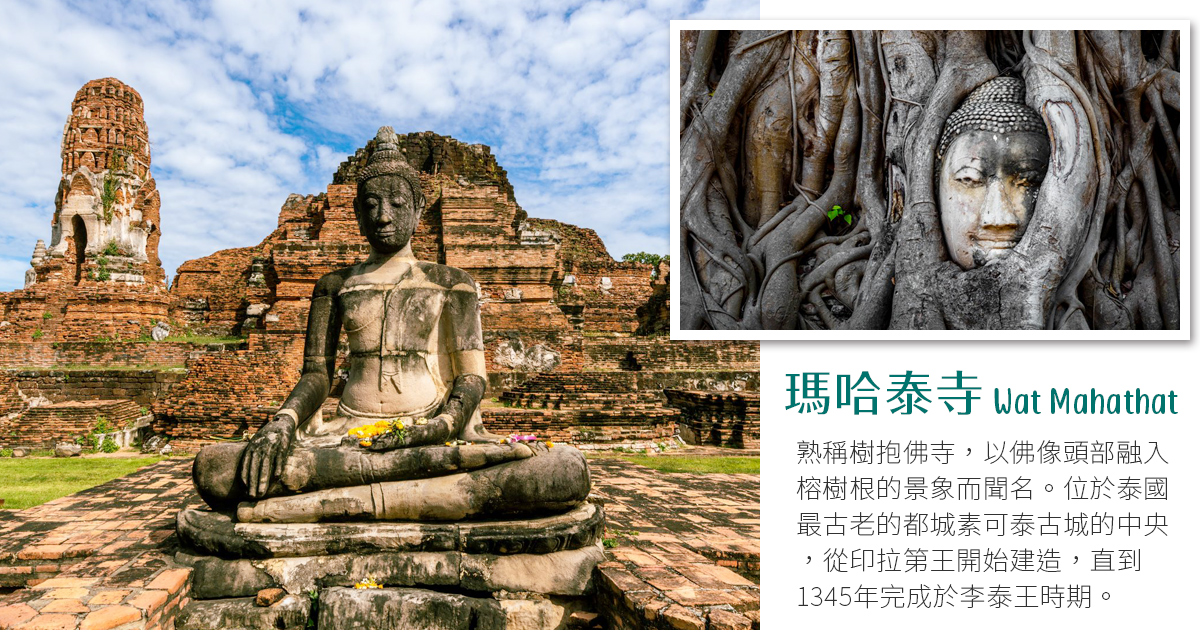 瑪哈泰寺是大城府最著名的寺廟之一,興建於1374年,是大城王朝時期供奉佛陀舍利,以及舉行皇家各種儀式的地方;瑪哈泰寺原本共建有198座佛塔,是泰國當時最早建造的高棉式建築,現多已倒塌或在戰火中被炸毀,但僅存的遺跡仍於1991年被列為世界遺產。此外,瑪哈泰寺最有名的就是樹中佛陀,也就是被樹根包住的佛陀頭像,有兩個留傳的版本:一是小偷砍下佛頭,發現太重帶不走,所以遺留在樹邊。另一則是緬甸軍入侵時破壞佛寺,佛陀頭像滾落至樹邊,後來樹生長起來包住佛陀。另外要注意的一點是如果要和佛陀合影留念,必須蹲下,不能超過佛像的高度以示尊敬。