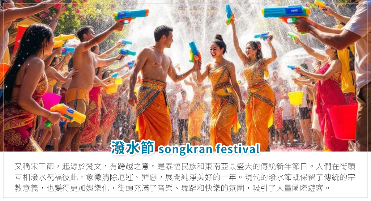 潑水節是泰國的傳統新年慶祝活動,這個節日最著名的活動就是街頭潑水,人們互相潑水來祝福彼此,象徵潔淨和新的一年開始。吸引了大量國際遊客,街頭充滿了音樂、舞蹈和快樂的氛圍。現代的潑水節既保留了傳統的宗教意義,也變得更加娛樂化~尤其是在泰國的各大城市如曼谷、芭達雅、大城等地,潑水的場面非常熱鬧。