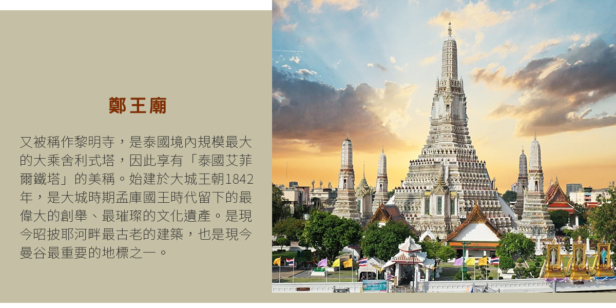 鄭王廟又被稱作黎明寺。是泰國境內規模最大的大乘舍利式塔,因此享有「泰國艾菲爾鐵塔」的美稱。始建於大城王朝1842年,是大城時期孟庫國王時代留下的最偉大的創舉、最璀璨的文化遺產,這使得鄭王廟成為現今昭披耶河畔最古老的建築、參觀量最高的寺廟,也是現今曼谷最重要的地標之一。