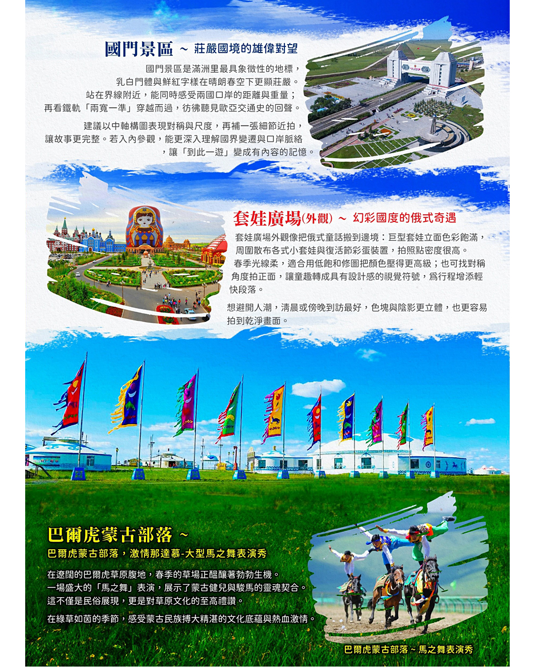 巴爾虎蒙古部落,激情那達慕-大型馬之舞表演秀巴爾虎蒙古部落民俗旅遊度假景區位於滿洲里以東36公里。位於301國道於滿洲里至額爾古納公路交界處,其是呼倫貝爾唯一家以展現原生態巴爾虎民族、民風、民俗為特點的民族風情旅遊景點。全方位、多角度向遊客展示蒙古民族博大精湛的文化。它位於巴爾虎草原腹地,這裏夏秋兩季,綠草如茵,牛羊肥壯,氣候涼爽,幽靜宜人。(0525-0915期間表演,不便之處敬請見諒)