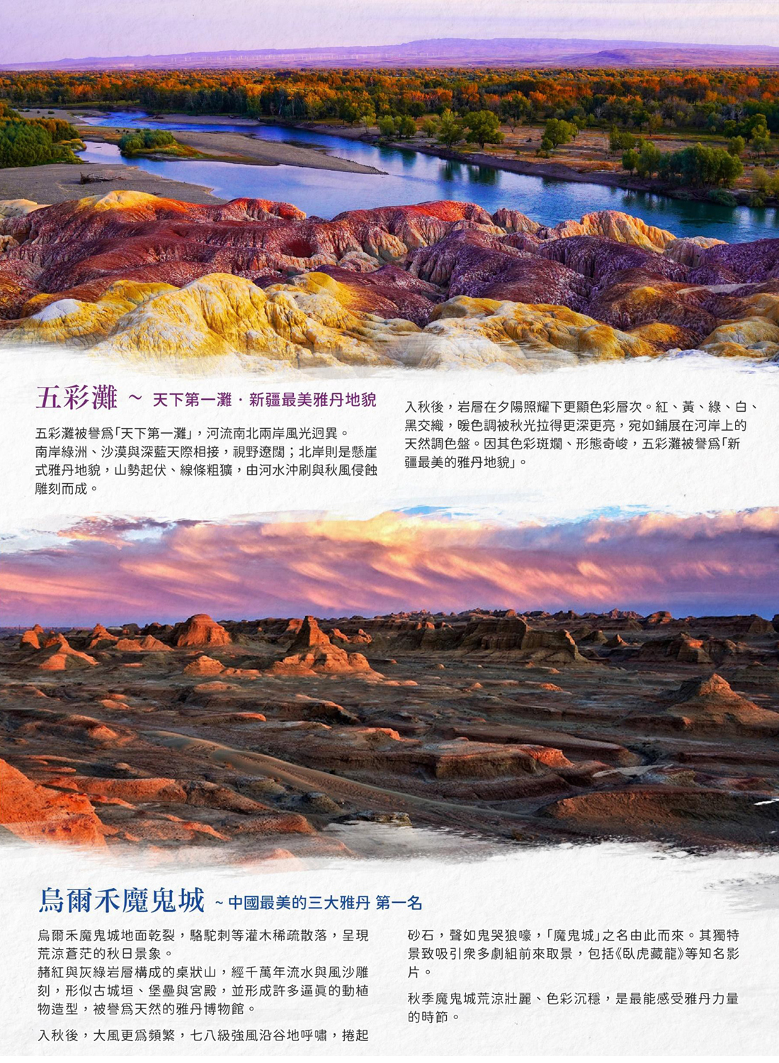 ★【五彩灘】深紅、黃、橙、綠、青灰…等多種色彩鮮艷的泥、葉岩互層構成的低丘群,觀 賞布爾津、觀賞『額爾齊斯河』日落。
