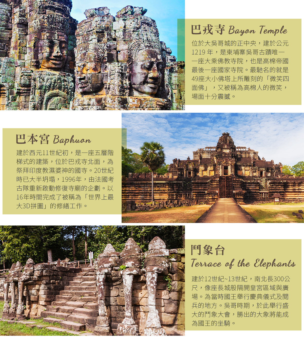 吳哥窟 / 大吳哥城 / 巴戎廟(微笑高棉) / 巴本宮殿 / 古代法院 / 鬥象台 / 12生肖塔 / 小吳哥城 / 巴肯山落日餘暉