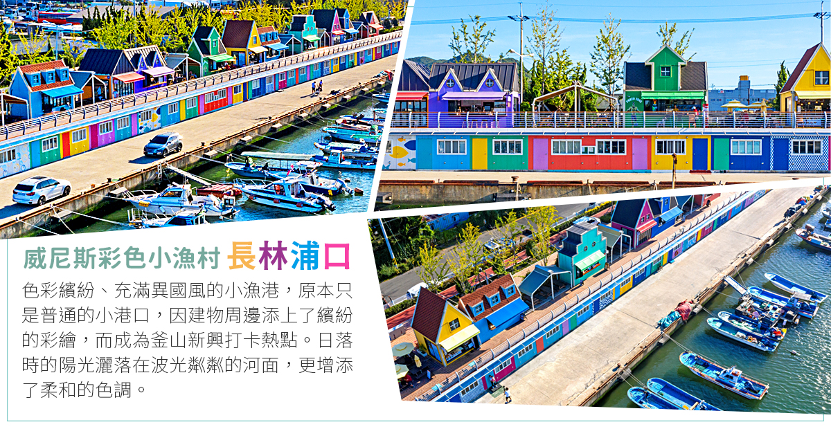 【威尼斯彩色小漁村】(長林浦口+紅頂風車屋+ 彩色貨櫃屋)釜山的威尼斯,長林浦口充滿色彩繽紛以及異國風情的小漁港,也是打卡熱門景點。這裡原本只是一個小港口,因為加上繽紛的彩繪而煥然一新,連指標都是可愛的繽紛色彩。
